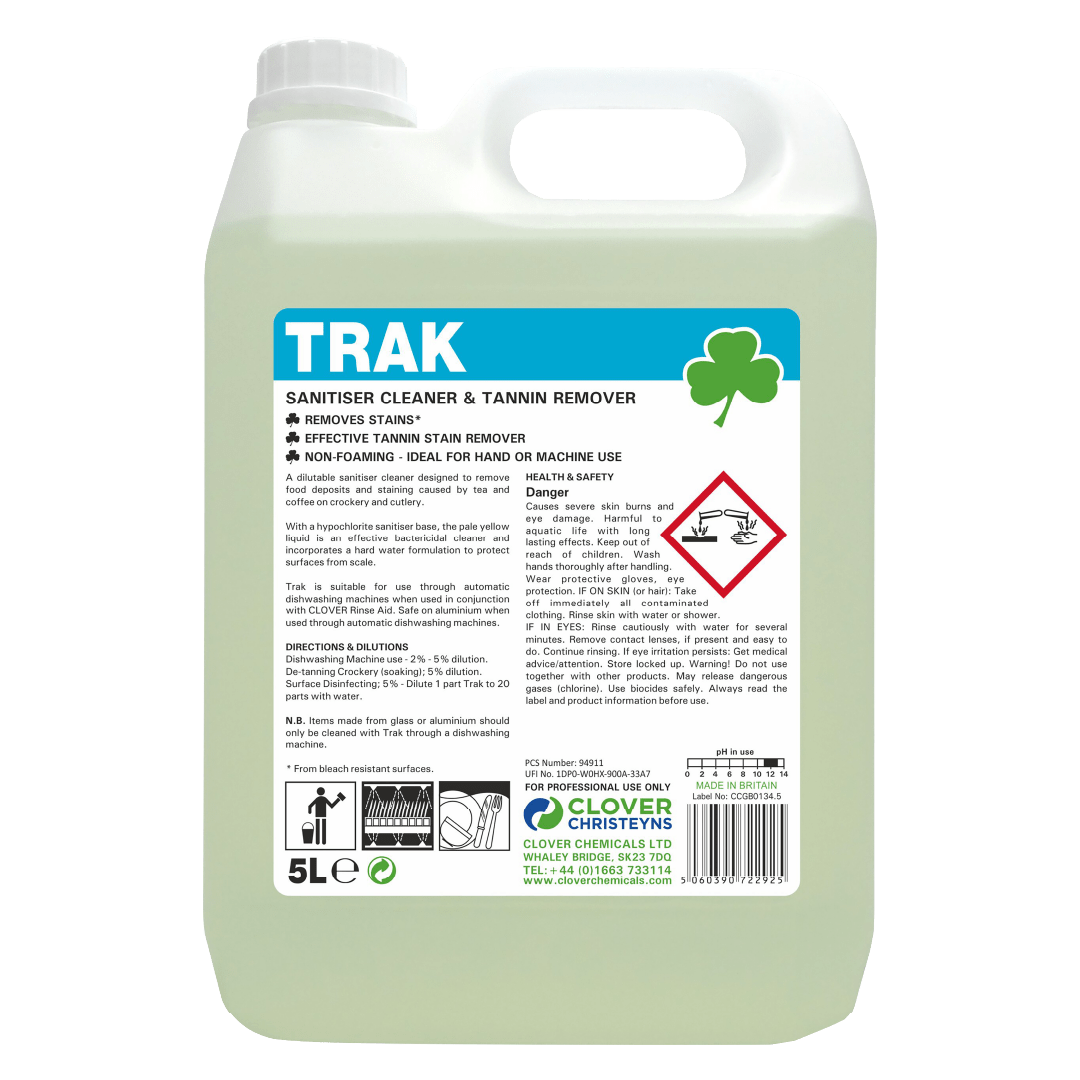 Featuring a hypochlorite sanitiser base, this pale yellow liquid incorporates a hard water formulation designed to safeguard surfaces from scale. Clover Trak excels in effectively removing grease, protein, fats, fruit, and sugars from glass, crockery, and all hypochlorite-resistant surfaces. Ideal for cleaning and sanitizing in kitchen and catering environments.